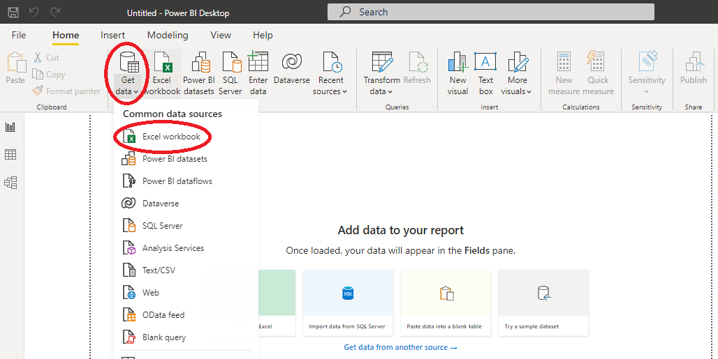 Ahora vamos a PowerBi para cargar el archivo Sucursales_no_clientes.xlsx, vamos a la opción GET DATA y seleccionamos EXCEL WORKBOOK, como en la siguiente imagen.