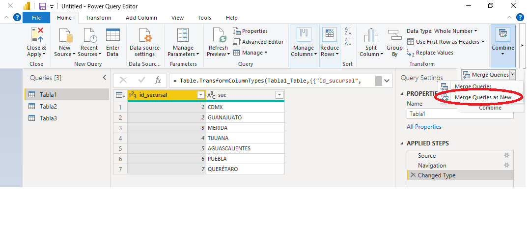 Ahora que tenemos Tabla 1 y Tabla 2 unidas, vamos a combinar el resultado con la tabla 3 (Esto es pegarla al lado). Para eso vamos a la pestaña COMBINE y la opción Merge Queries as New.
