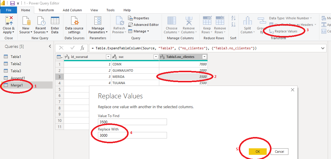 En esta ventana a la izquierda pinchamos la tabla Primero MERGE1, que corresponde a la tabla de las sucursales con su respectiva cantidad de clientes. El segundo paso en la correspondiente tabla, nos posicionamos sobre el valor a reemplazar, en este caso sobre el valor 3500. Paso 3 presionamos sobre la opción REEPLACE VALUES. Paso 4, presionamos sobre la opción REEPLACE WITH e ingresamos el nuevo valor. Paso 5 presionar OK. Note que los pasos están enumerados, si los sigue en el orden correspondiente, debería obtener los mismos resultados.