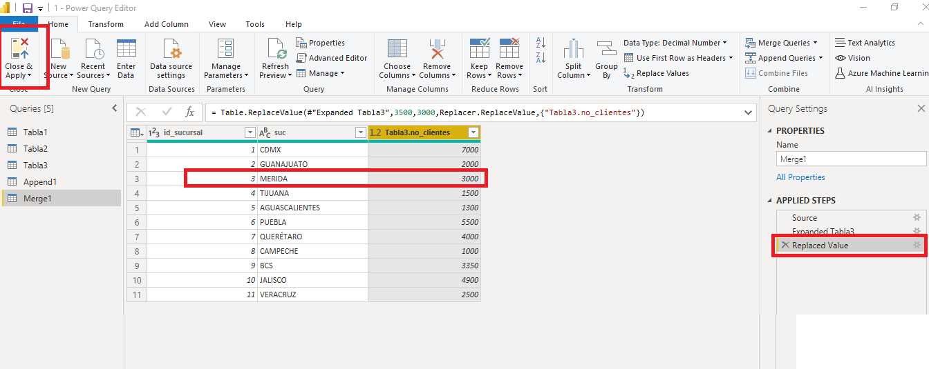 Notar que en la parte derecha denota los pasos aplicados sobre la tabla MERGE1. En la esquina superior derecha, presionamos CLOSE AND APPLY.